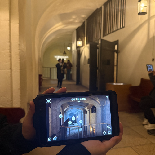 동그란 표식을 찾아서 카메라로 비추면 당시 감옥의 모습이 증강현실처럼 생생하게 재현돼요.